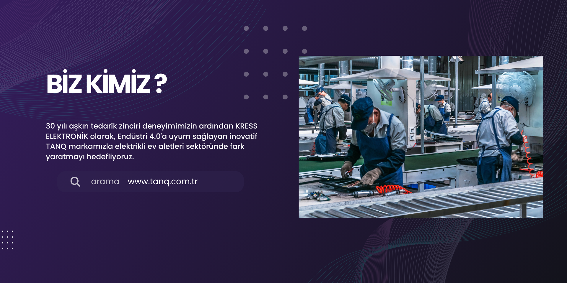 Endüstri 4.0’ın getirdiği eko-sistemine hızla adapte olan ve esneklik, hız, verimlilik, sürdürülebilirlik ilkelerini merkezine alan TanQ; üretimden pazarlamaya, satıştan satış sonrası hizmetlere kadar elektrikli ev aletleri sektöründe benzersiz bir deneyim sunma amacındadır. Başlangıçta tüketici taleplerini ve yararını öncelikli tutarak yola çıktığımız bu ürün serüvenimizde, fikir aşamasından tasarım ve üretime uygunluk süreçlerine kadar her aşamada detaylı bir planlama ve uygulama süreci izlemekteyiz. Üretim sürecimiz, ara mamül ve hammadde denetiminin yanı sıra ürünün üretim anındaki kontrol, bant sonu kontrol ve kutu hasar testleri ile desteklenmektedir.